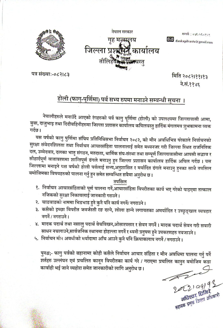 होली पर्व सभ्य रूपमा मनाउने सम्बन्धि सूचना ।