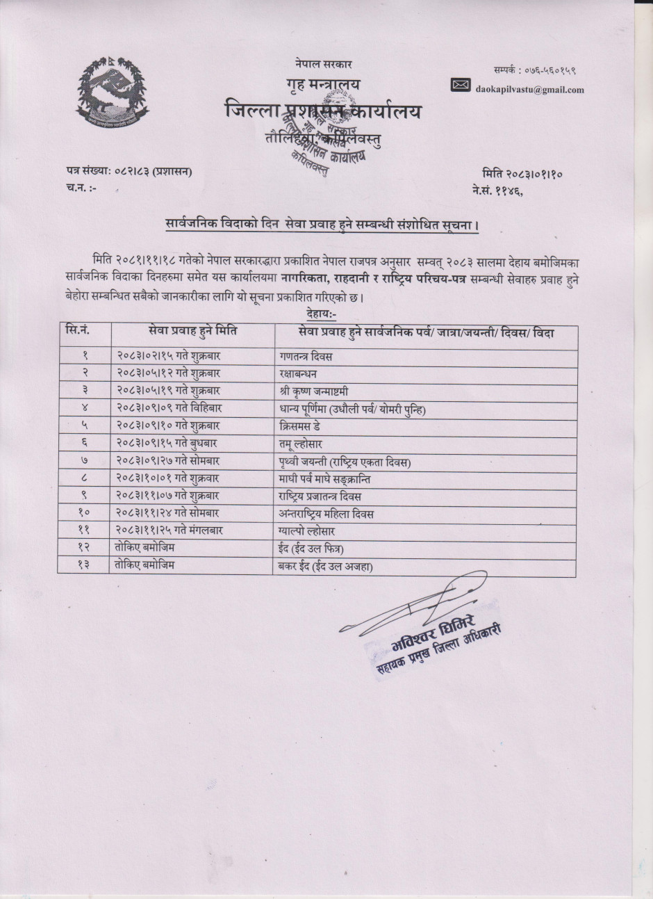 सार्वजनिक विदाको दिन सेवा प्रवाह हुने सम्बन्धी संशोधित सूचना ।